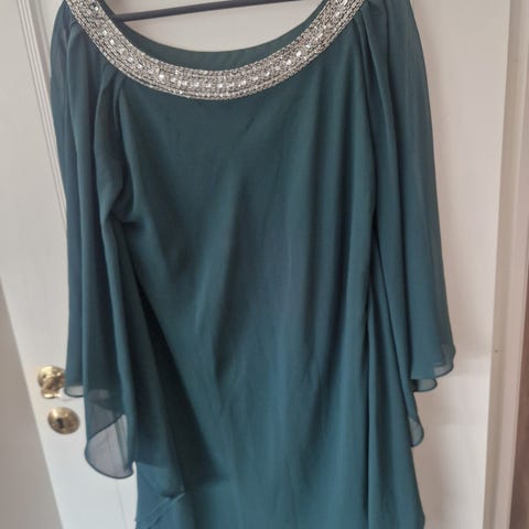 Goddiva festkjole i chiffon for dame i størrelse 42. Kjolen er grønn og har et langt, flytende skjørt. Materialet er lett og faller mykt. Passer til formelle anledninger og selskaper der en lang festkjole er ønsket. Kjolen har fått en «snurping» i en tråd, se bilde. Selges derfor billig. Synes ikke ved bruk.