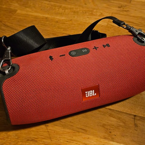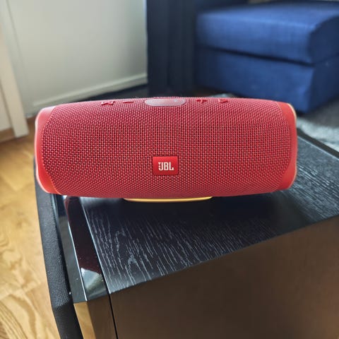 Jeg selger denne oppladbare høyttaleren fra JBL. Den spiller veldig bra, og alt funker slik det skal.