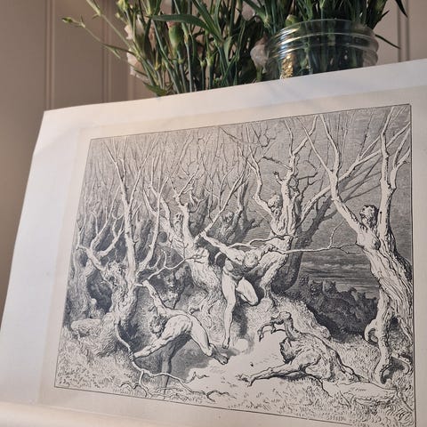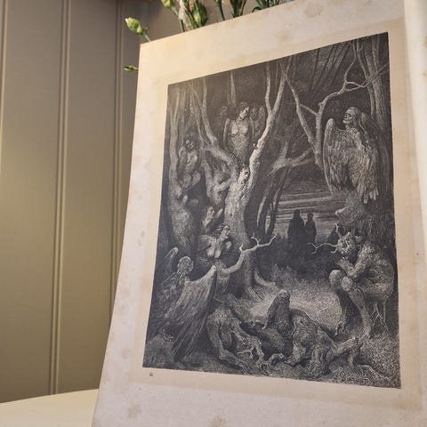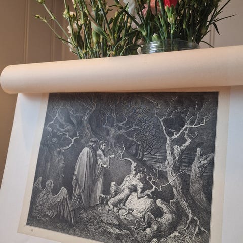 Nøkkelord: Dante, Den Gudommelige Komedie, Divine Comedy, Helvete, Inferno, poesi, poet, legendarisk, gravering, gravering, etsning, angst, livet. døden