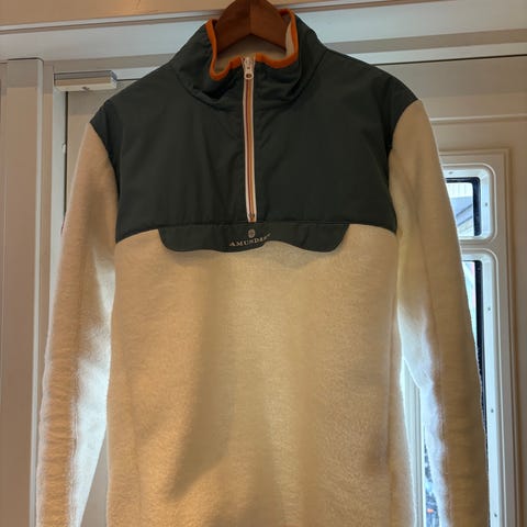 Amundsen jakke i fleece for herre i størrelse M. Jakken er i beige farge med kontrastfelt øverst og halv glidelås i front. Mykt fleece-materiale gir god isolasjon og komfort. Modellen har høy krage og brodert merke på ermet. Egnet som mellomlag eller ytterlag ved kjøligere vær og til hverdags- og friluftsbruk.