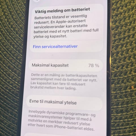 Telefonen har en skjerm med tydelige riper og merker, og en linje som er indikerer på at den er litt knust slik bildene viser. Bakside og ramme kan også ha bruksspor. Enheten har 256 GB internminne som gir god plass til apper, bilder, video og andre filer.