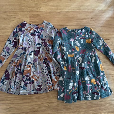 Polarn O. Pyret snurrekjoler til jente i størrelse 110. Både mor og datter har vært veldig fornøyde med disse kjolene. Faller veldig fint på kroppen. Rosa kjole har noen røde malingsflekker som ikke gikk av i vanlig maskinvask.