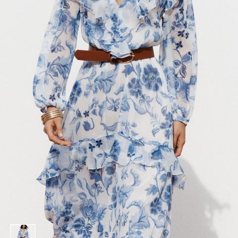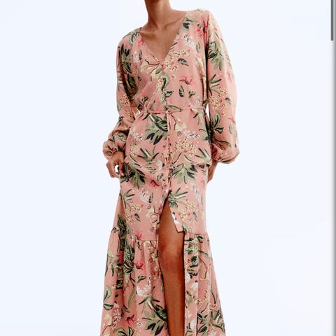 Gina Tricot festkjole for dame i størrelse M. Kjolen er blå med blomstertrykk og laget i polyester. Den har dyp v-utringning, lange puffede ermer og markert liv med knappe- eller rynkedetaljer foran. Skjørtet er langt med splitt foran. Helt ubrukt!