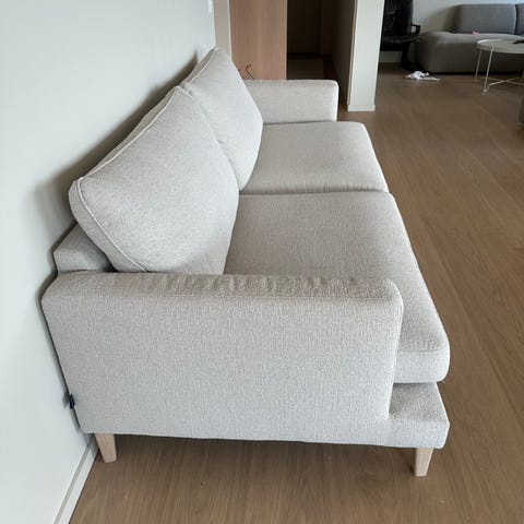 Lys hjørnesofa, noen små bruksmerker. Ingen flekker men litt rufsete/nuppete stoff på sidevangen. Jeg la først merke til disse bruksmerkene da jeg skulle støvesuge sofaen, så vil si at de ikke synes særlig godt.