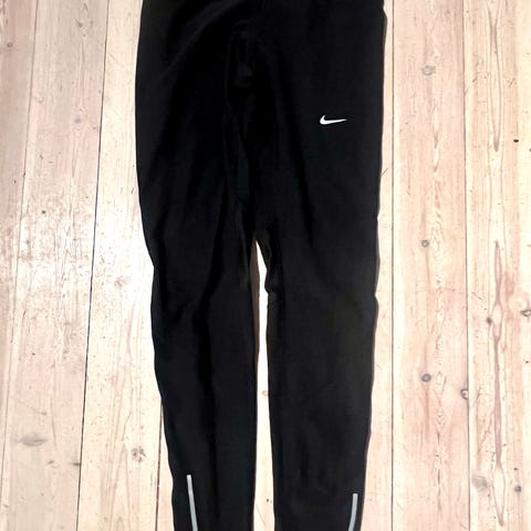 Nike løpetights for dame i størrelse S. Tightsen er svart og har strikk og snøring i livet for justerbar passform. Smal, ettersittende modell som egner seg til løping og annen trening. Refleksdetaljer på bena og glidelås nederst på leggen for enklere av- og påkledning. Laget i elastisk materiale som gir god bevegelighet under aktivitet.