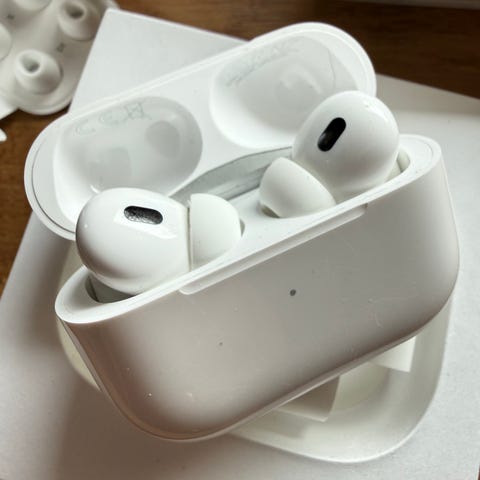 Selger et par pent brukte AirPods Pro 2. Disse har USB-C ladeinngang og støtter MagSafe trådløs lading.