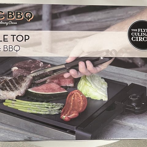Exxter elektrisk grill i bordmodell med stativ. Grillen har varmeelement over hele flaten og dryppbeholder under risten. Kan brukes både med og uten stativ, for eksempel på bord eller terrassegulv.