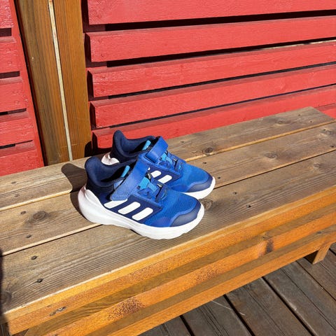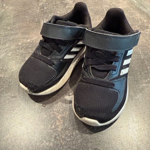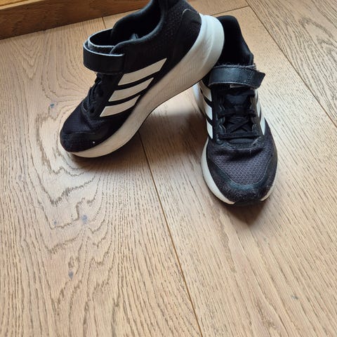 Adidas joggesko for barn i størrelse 28, unisexmodell. Skoene er svarte med hvite Adidas-striper på sidene. Overdelen er i tekstil og syntetisk materiale med snøring og borrelåsrem over vristen. Yttersålen er i gummi med mønster for grep. Egner seg til hverdagsbruk og aktivitet for barn. En av borrelåsremmene er skadet, se bilder for detalj.