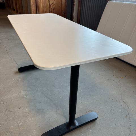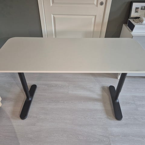 Elegant skrivebord fra IKEA med en praktisk hvit plate. Dette skrivebordet er ideelt for kontor eller hjemmekontor, og gir både arbeidsplass og stil til innredningen.