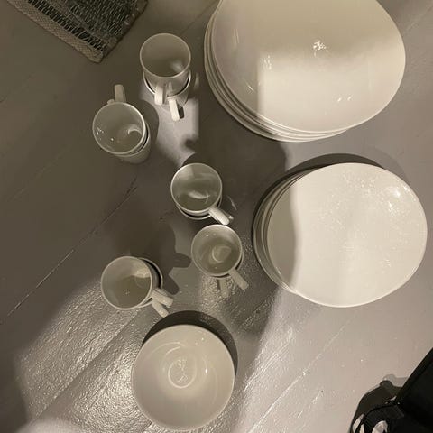 Aida servise i hvitt porselen. Settet består av tallerkener, skåler og kopper i ensfarget hvit med enkel rillet kant på tallerknene. Deler til både middag, frokost og kaffe. En av skålene har et lite hakk i kanten, ellers fremstår delene som hele på bildene, men noen få tallerkner kan se litt matte ut etter normal slitasje. 12 tallerkener 12 dype tallerkener 12 forkost asjetter 11 kaffekopper 3 store skåler 8 små skåler.
