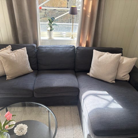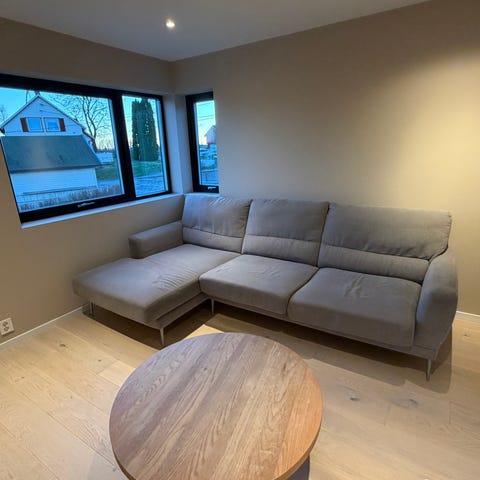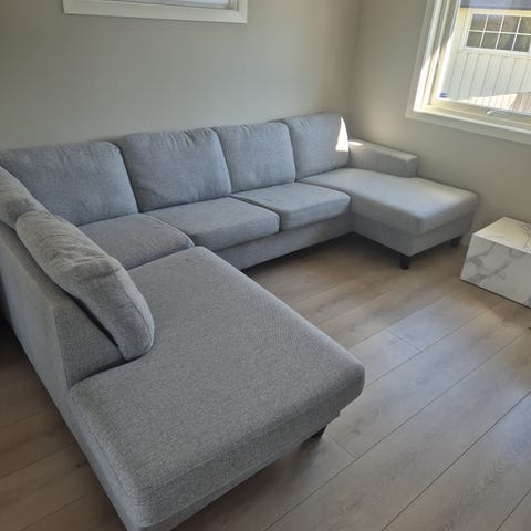 3-seters sofa i grå tekstil. Sofaen har tre sitteputer og tre ryggputer, samt regulerbare nakkestøtter som kan felles opp og ned etter behov. Sofaen er godt vedlikeholdt og pent brukt. Passer som hovedsofa i stue eller TV-stue. God og behagelige sitteputer.