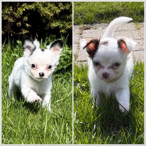 Far,Freddie, 3,5 kg, 50% chihuahua og 50% malteser. Rolig og snill,elsker å gå lange turer. Freddie er ganske spesiell med et øre som står opp og et øre som henger ned.