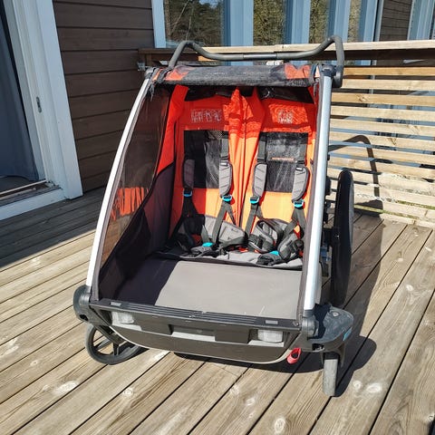 Thule Chariot CX 2 sykkelvogn. Vognen har tre hjul, med stort forhjul som egner seg til løping og turer på variert underlag. Den har plass til to barn, med polstret sete og justerbare 5-punkts seler. Fronten har netting og gjennomsiktig overtrekk for beskyttelse mot vær og vind. Bak finnes oppbevaringslomme til utstyr. Sykkelvognen kan brukes både som barnevogn og som tilhenger etter sykkel.