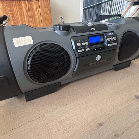 JVC bærbar radio/boombox i sølv og svart. Enheten har innebygde stereohøyttalere i front, bærestropp med JVC-logo og kontrollpanel med display og knapper på toppen/fronten. Passer til avspilling av radio og tilkobling av strøm. Ytterligere funksjoner som eventuelle tilkoblinger eller medieavspilling er ikke spesifisert.Retro fra 80 tallet Selger den pågrunn av ønsker en som er mindre Må hentes i Lørenskog