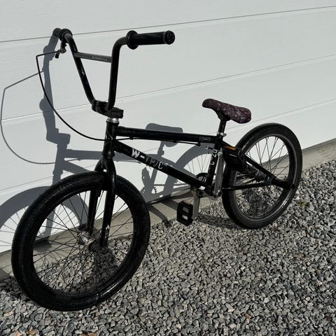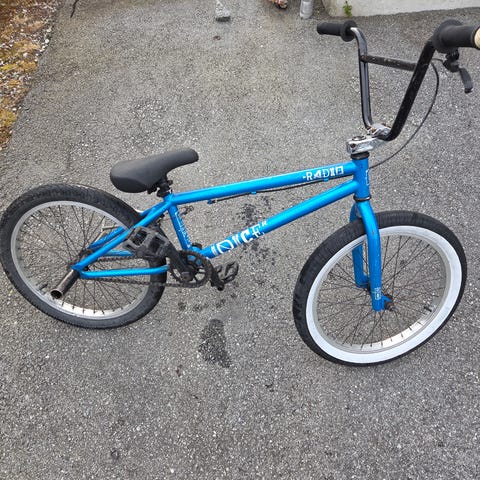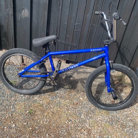 BMX barnesykkel med 20" hjul. Sykkelen har BMX-ramme med høy styrestang og rett sete. Fargen er blå med lyseblå gaffel og styre. Egnet for barn som passer til 20" hjul, for sykling på asfalt, grus og enkel lekesykkelbruk.