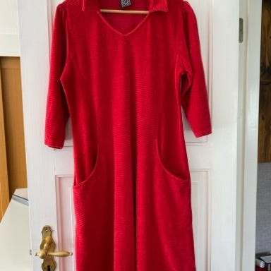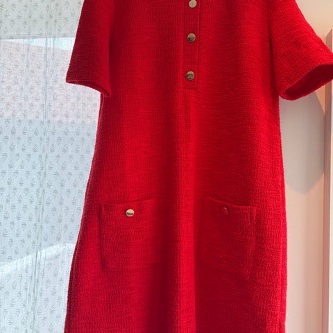 KO:KO Lisbeth hverdagskjole i størrelse 44. Kjolen er rød og har lange ermer, rund hals og dekorative knapper foran øverst på brystet. Modellen har to sidelommer og et strukturert stoff. Materialet består av 70 % viskose, 28 % polyester og 2 % elastan, som gir litt stretch og en myk følelse. Egnet som hverdagskjole til dame.