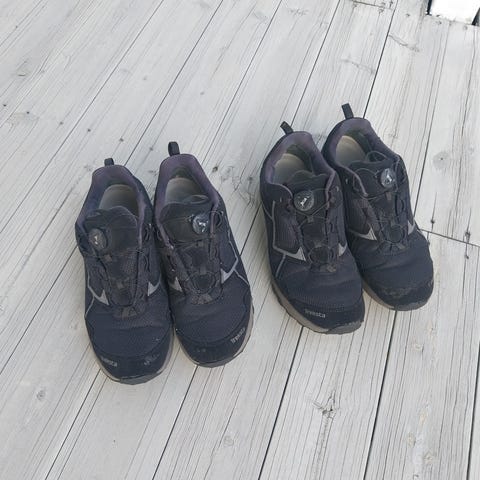 Treksta tursko med Gore-Tex-membran i størrelse 46. Overdelen er i svart tekstil med forsterkninger, og sålen har grovt mønster som gir godt grep på variert underlag. Gore-Tex-membranet gjør skoene vannavvisende og pustende.