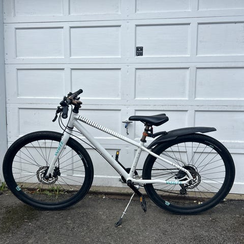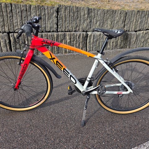 Lett barnesykkel med 26" hjul i hvit farge. Sykkelen har flat styretype og girsystem bak. Utstyrt med hydrauliske skivebremser, Shimano Acera girsystem, skjermer og støtte. Egnet for barn som passer til 26" hjulstørrelse. Trenger en vårvask og en liten girjustering. Lite rift i setet. Se bilde.
