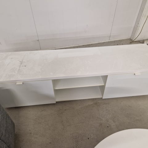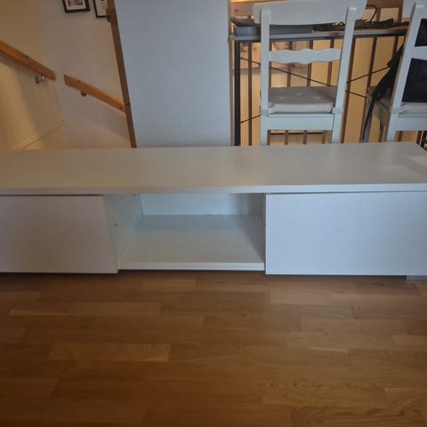 TV-benk selges pga ønske om overgang til en større TV-benk. Den er i hvit høyglans og passer veldig godt inn i de fleste rom. Den er i god stand og pent brukt, men vanlige bruksmerker må medregnes da denne er brukt i noen år. Den har to skuffer som gjør det veldig enkelt å oppbevare ting. TV-benken ble kjøpt på Jysk for noen år siden.