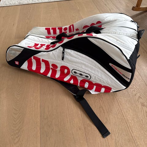 Selger min stilrene og romslige Wilson Super Tour 9 Pack racketbag i klassisk Wilson-rød. Bagen ble kjøpt ny våren 2024 for 1395 kr og er svært pålitelig.