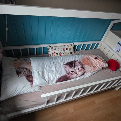 Hei selger husseng til gutten min da den er egentlig ikke i bruk, ungen sover med oss til hverdag, madrassen og sengen er fin og pen ingen flekker, madrassen var beskyttet til ellers kan hentes på Tjodalyng