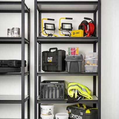Garderobestativ med hyller i svart metallramme og "treflater".