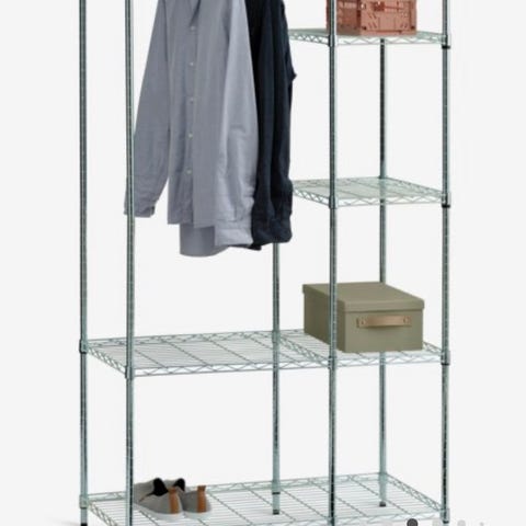 Har flere hyller for oppbevaring og plass til å henge klær.