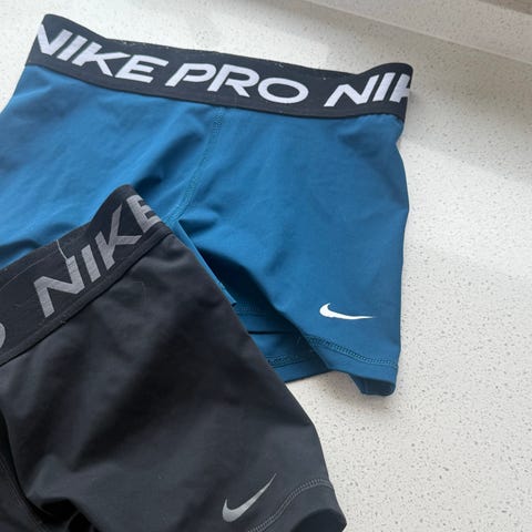 Nike Pro shorts i størrelse S. Pakken består av tre korte shortser i burgunder, blå og svart. Shortsene er pent brukt, uten bruksmerker!