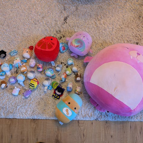 Beskrivelse: Selger en pent brukt samling av Squishmallows og Ty Squish-A-Boos. De har for det meste stått til pynt og fremstår som pent brukt.