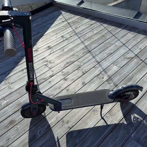 Fin som første elsparkesykkel. Ikke høyere fart enn 20km t som er maks hadtighet for barn.