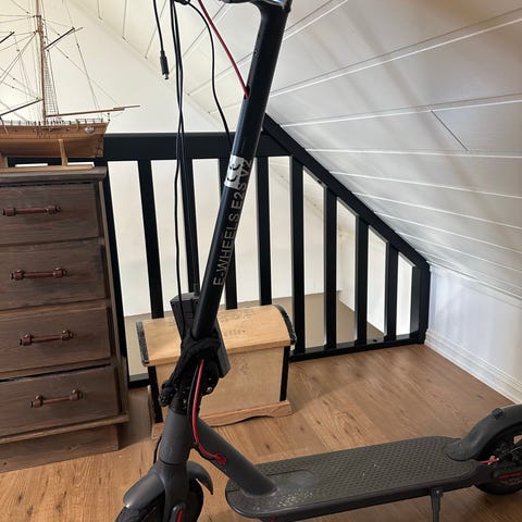 Følger med ladeledning, trekk for transport, veske til å feste foran på ratt, elsparkesykkel lås med alarm. Lite brukt.