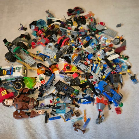 Stor haug med 1825 gram lego minifigurer, figurdeler, og tilbehør. Noen sykler og noen bionicle masker. Se bilder.