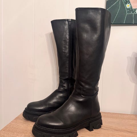 Tommy Hilfiger støvler i størrelse 39. Støvlene er svarte med kraftig, mønstret yttersåle som gir godt grep. Overdelen fremstår som glatt og ensfarget. Skaftet går opp mot leggen for mer dekning. Passer til bruk i hverdagen og i kjøligere værforhold.