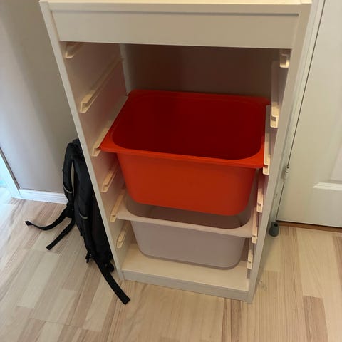 IKEA oppbevaringshylle med plastkasser for barnerom eller generell oppbevaring. Hyllen er i hvit utførelse og har flere uttrekkbare plastkasser i ulike farger (grønn, rød, turkis og svart). Egnet til oppbevaring av leker, hobbyutstyr eller andre småting. Stabil konstruksjon som står direkte på gulvet, med kasser som kan tas ut ved behov.