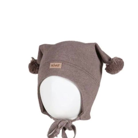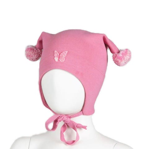 Lua er rosa med strukturmønster og to dusker på toppen. Den har knyting under haken for å sitte godt på hodet.