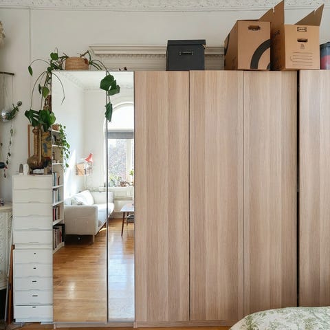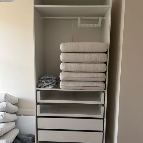 I begge skapene er det stang for henging av klær. I det ene skapet er det hyller 4 hyller og i det andre er det 3 skuffer.