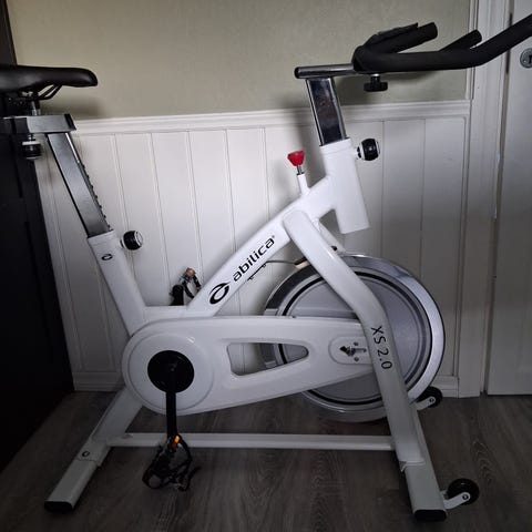X-erfit spinningsykkel i hvit utførelse. Sykkelen har justerbart sete og styre for tilpasning til bruker, samt reimhjul med manuell motstandsregulering via dreiehjul foran på rammen. Utstyrt med pedaler med tåstropper og flaskeholder på rammen. Egnet til innendørs kondisjonstrening og intervalløkter hjemme.