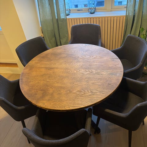 Pent brukt spisegruppe fra Sandvik. Kjøpt på 90-tallet. Den inneholder 8 stoler hvorav 1 kongestol. Ingen flekker. 2 innleggsplater. Uten plate 148 cm lengde, med 1 plate 185 cm lenge og 2 plater 225 cm lengde. Bredde 99 cm og høyde 75 cm.