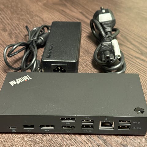 Lite brukt Lenovo ThinkPad Thunderbolt 3 Workstation Dock (DK1841) selges. 170W strømforsyning (PSU) følger med. USB-C/Thunderbolt-kabel medfølger ikke. Docken er funksjonstestet på en Lenovo T570 med Thunderbolt 3 (USB-C)-kabel. Alle porter, inkludert strømforsyning, er testet og fungerer. Dock og PSU er rengjort, og nyeste firmware (v3.1.82) ble installert 24.02.2026. Kjøper er selv ansvarlig for å kontrollere at docken er kompatibel med laptop/enhet før kjøp.