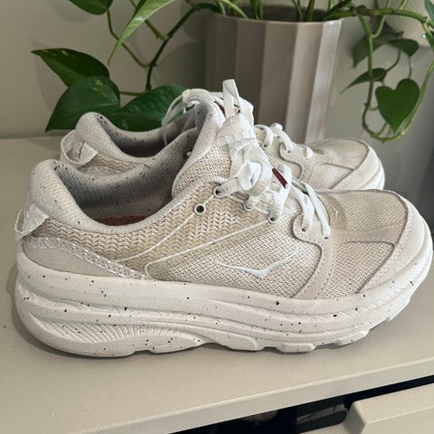 Hoka joggesko i størrelse 40. Skoene er i svart farge med hvit såle og Hoka-logo på siden. Modellen har snøring foran og en kraftig mellomsåle som gir god demping. Passer til hverdagsbruk, gåturer og lett trening. Materiale fremstår som tekstil og syntetisk overdel med gummisåle.