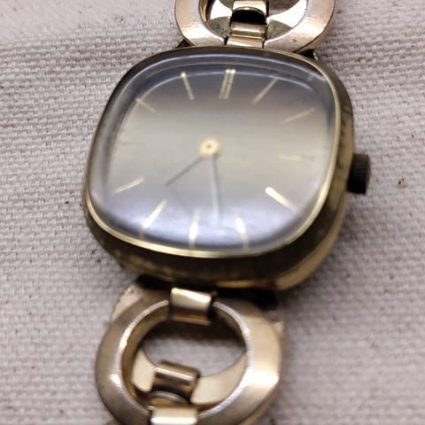 Elegant vintage klokke fra Maurice Lacroix med klassisk rektangulært design og gullfarget kasse. En tidløs modell. Trekker opp og starter som den skal, holder tiden ved visuell observasjon. Kronen sitter noe stramt ved uttrekk, men fungerer. Bruksmerker på kasse og glass. Selges som vintage klokke uten garanti.