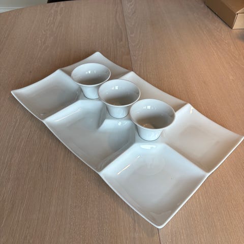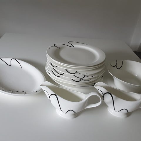 Modern House servise i hvitt porselen med sort dekor. Serviset består av tallerkener, dype tallerkener, skåler og serveringsfat, alle i samme design. Porselenet er slitesterkt, tåler oppvaskmaskin og kan brukes i mikrobølgeovn. Egner seg til daglig bruk på kjøkken og spisestue.