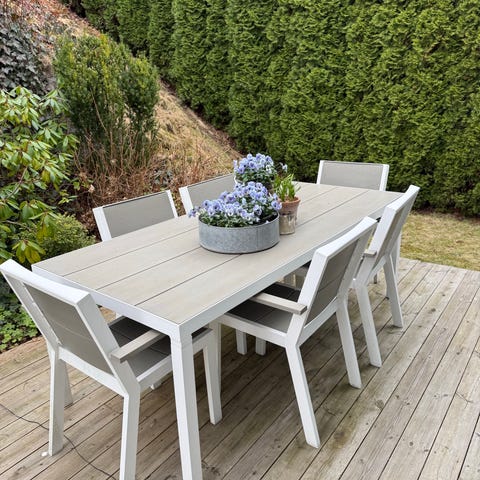 Hagebord med glassplate og seks tilhørende stoler med puter. Stolene har høy rygg og armlener for mer støtte ved sitting.