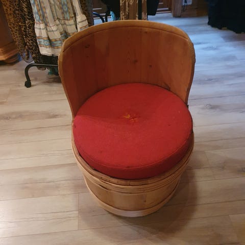 Pent brukte tønner med oppnevaring. Lokket med pute kan trekkes om.