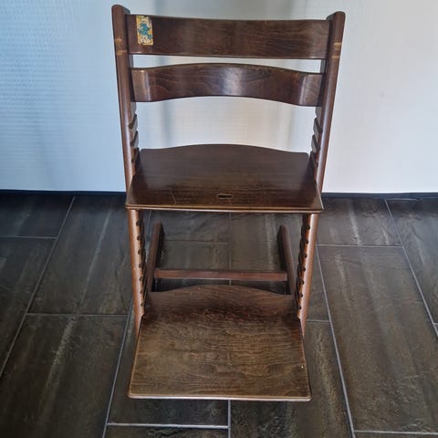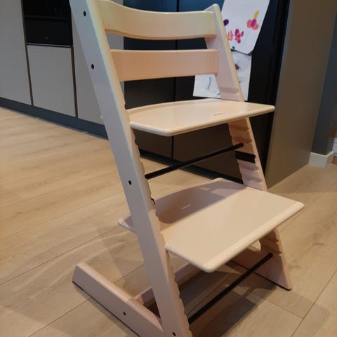 En eldre modell av Stokke Tripp Trapp barnestol malt i en lys rosa farge. Stolen har justerbart sete og fotbrett som kan flyttes i høyde og dybde etter barnets størrelse. Egner seg til bruk ved spisebord eller som sitteplass for barn i ulike aldre. Klassisk konstruksjon i tre med metallstag under sete og fotbrett for stabilitet.