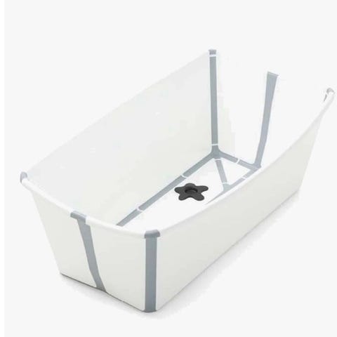 Sammenleggbart badekar som er egnet for småbarn. Badekaret er laget i plast med forsterkede kanter og støttebånd. I bunnen er det en propp for enkel tømming av vann.