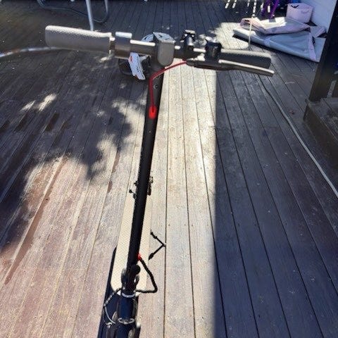 Elektrisk sparkesykkel i svart farge. Modellen har ståbrett, styre med håndtak og forhjul med rød felgdetalj. Egnet til kortere turer på asfalt og jevnt underlag. Passer for én person av gangen. Nærmere tekniske spesifikasjoner som rekkevidde, motoreffekt og batterikapasitet er ikke oppgitt og bør eventuelt avklares med selger. Denne er lovlig og kjører 20km timen!
