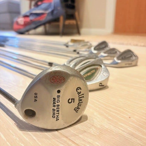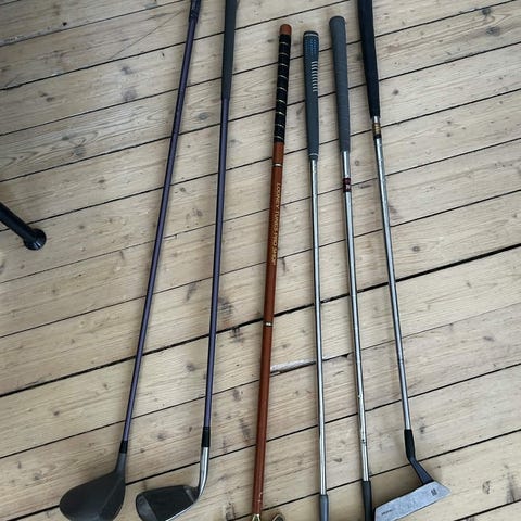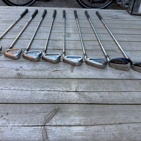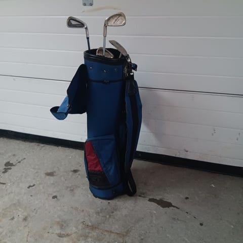Inneholder flere jern (ulike nummer), sand wedge (55°) og en 5 wood.