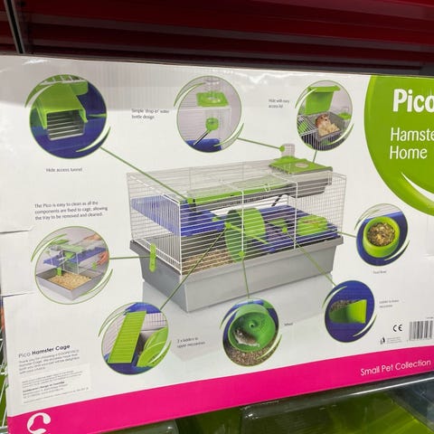 Med buret følger variert tilbehør som løpehjul, hus i tre, leker, matskåler, drikkeflasker og ulike gjemmesteder.
