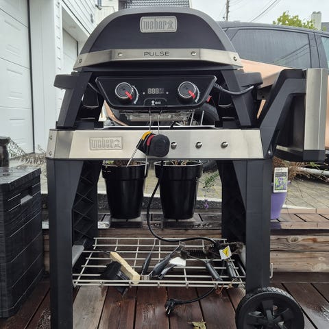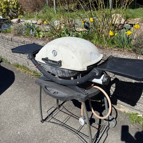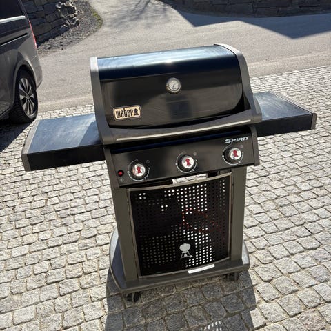 Weber gassgrill i svart utførelse. Grillen har lokk med innebygd termometer og grillrist i metall. Modellen står på tralle med skap under grilldelen for oppbevaring, samt to hjul for enkel flytting. På siden er det en betjeningsdel med flere brytere til brennerne. Grillen kobles til gass med slange. Egnet til grilling av mat utendørs på terrasse eller i hage.